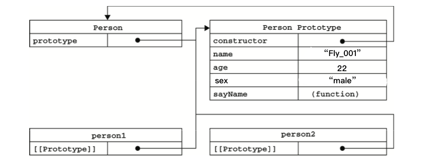 function Person() {} Person.prototype.name = 'Fly_001'; Person.prototype.age = 22; Person.prototype.sex = 'male'; Person.property.sayName = function() { alert(this.name); }; var person1 = new Person(); person1.sayName(); // 'Fly_001'; var person2 = new Person(); alert(person1.sayName == person2.sayName); // true;使用原型对象的好处是可以让所有对象实例共享它所包含的属性和方法。