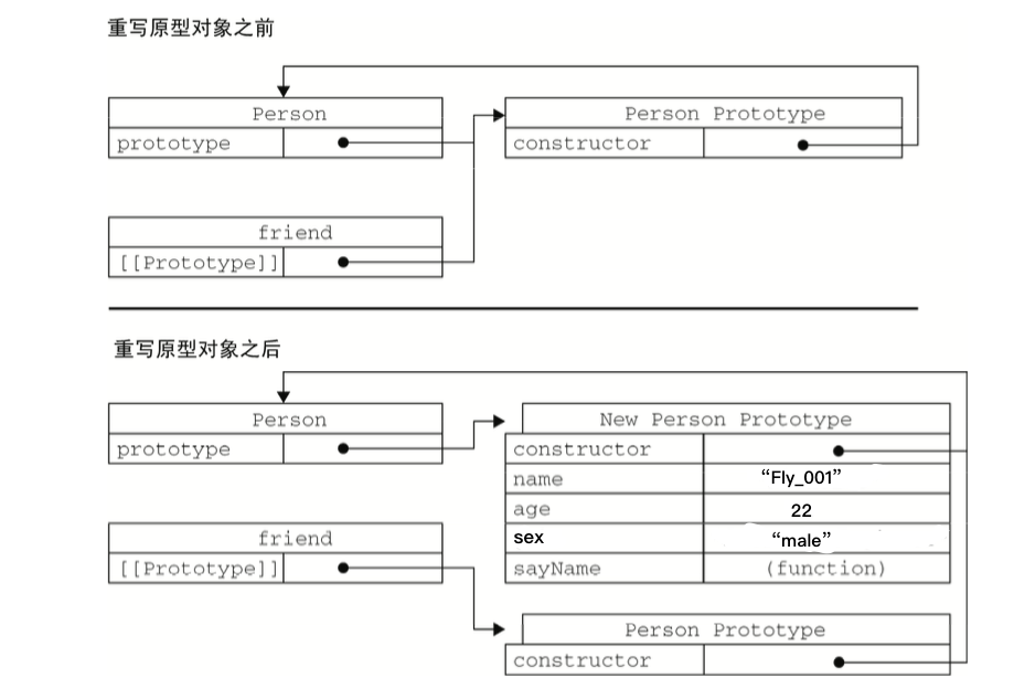 function Person() {} var friend = new Person(); Person.prototype = { constructor: Person, name: 'Fly_001', age: 22, sex: 'male', sayName: function() { alert(this.name); } }; friend.sayName(); // error!因为 friend 指向的原型中不包含以该名字命名的属性,下图展示了这个过程的内幕: