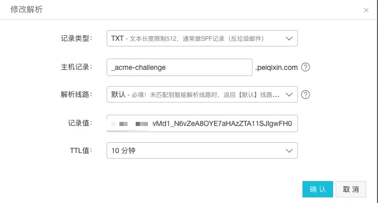 请把这段token复制下来。 打开你的域名提供商,就是你之前买域名的地方。添加一个域名解析。