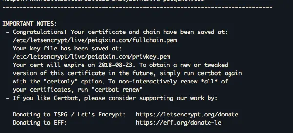 ssl_certificate /etc/letsencrypt/live/peiqixin.com/fullchain.pem; ## 这个就是你配置certbot最后一步要你记录下来的地址