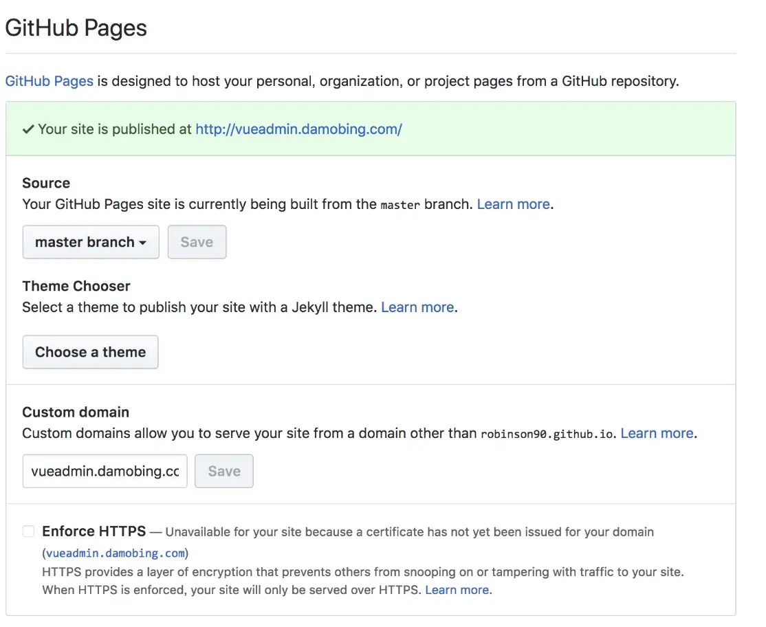 找到项目设置tab项里对应github pages部分改为下图所示。需要做的有:设置展示的分支,主题可以不选,然后如果你有域名可以直接这里写你绑定的自己的域名,相当于在项目根目录下添加了一个CNAME ,内容就是你的域名,不带协议的。
