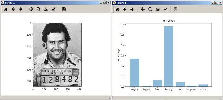 如果你看过 NetFlix 出品的《毒枭》系列,你一定很熟悉这张照片。下面这张照片是大毒枭巴勃罗·埃斯科瓦尔被捕入狱时照的照片。用我们刚才搭建的模型对这张照片识别后,显示巴勃罗当时的心情非常不错。