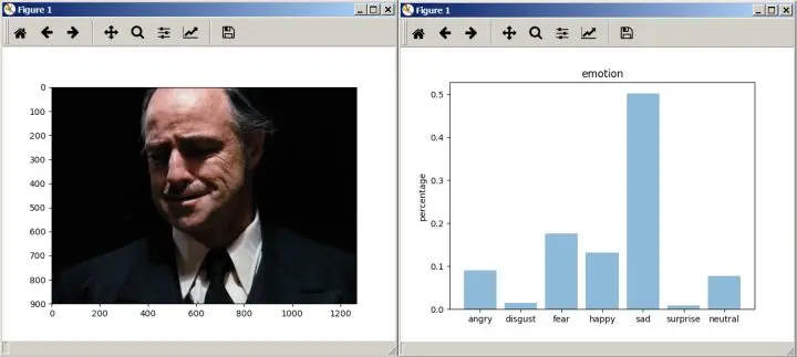 接着我们用第二张照片,马龙·白兰度在《教父》中饰演的“老头子”考利昂看到儿子尸体时的画面。测试结果显示模型也能识别出考利昂痛苦悲伤的表情。