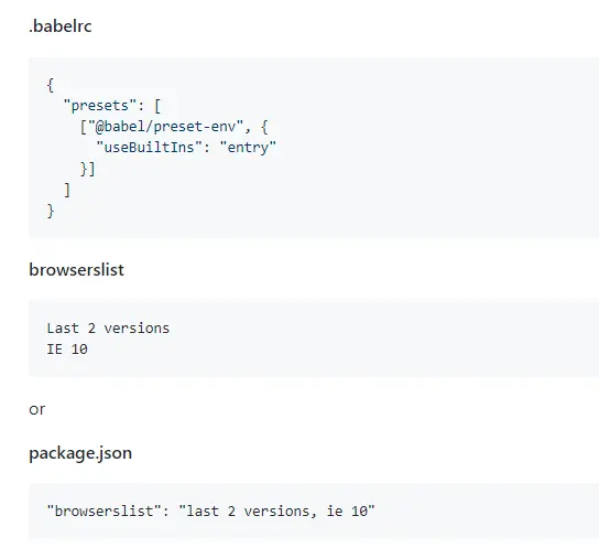 我们需要知道的是制定个targets的browsers时使用的是 browserslist ,我们可以在 .babelrc 文件、package.json文件、browserslist中指定浏览器版本选项,优先级规则是 .babelrc文件定义了则会忽略 browserslist、.babelrc 没有定义则会搜索 browserslist 和 package.json 两者应该只定义一个,否则会报错。