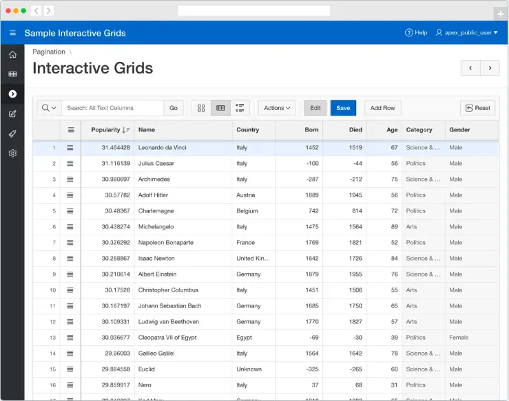 Oracle APEX 允许每个人看到不同的数据。利用交互式报表组件,用户可以轻松地自定义他们想看到的数据,以独特的方式满足需求。从确定要显示哪些列的简单更改到更加复杂的自定义设置(例如数据透视),都可以轻松实现。