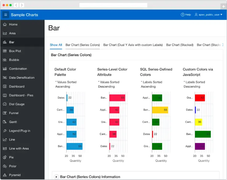 凭借 Oracle JET 图表库的支持,Oracle APEX 有能力让您拥有强大的图表可视化能力。您可以快速为您的应用程序添加漂亮的、高度可定制、易用且功能极其丰富的图表。