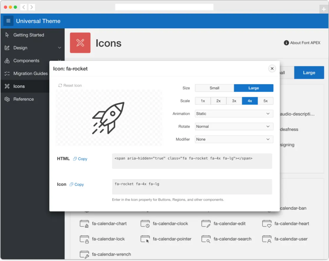 您可以轻松地自定义每个图标,比如:实时预览图标旋转、动画等效果。只需将相应的助手类添加到图标中,或使用通用主题(Universal Theme)应用程序中内置的 Icon Builder。