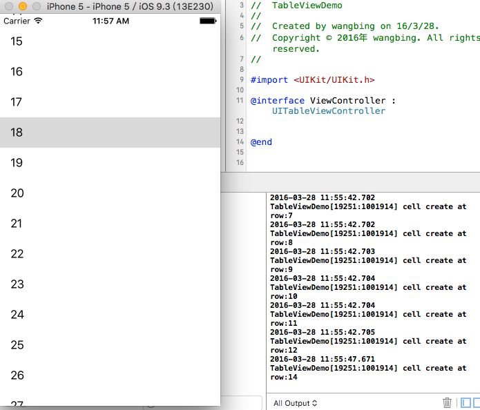 QQ20160328-4.png可以看到,只要当有新的cell显示时,cell就会重新创建,所以虽然共有20条数据,但是来来回回不停滑动会让cell一直重复创建,创建多了就会有问题