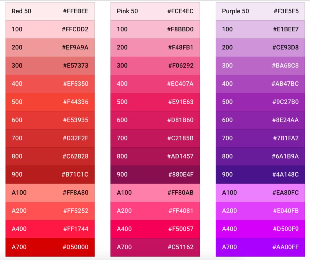 相信大家对这个色板应该不会陌生,这个就是著名的 Material Design 色板,这个色板广泛应用于插画、UI设计等优秀作品当中(差的作品我们假装没看到),只要你会灵活应用这个色板,你的配色一定不会差。