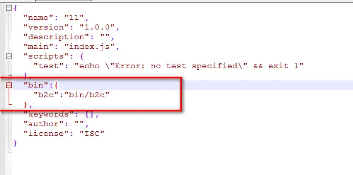 b2c文件(文件名称可以自行取名),不带后缀名,在package.json文件中加入一个bin对象
