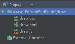 此demo未采用框架,用原生js实现,项目里是用react技术栈实现,打开你最喜欢的IDE,新建如下3个文件draw.js, draw.css, draw.html, 我这里是用webstorm编辑代码,demo结构如下图
