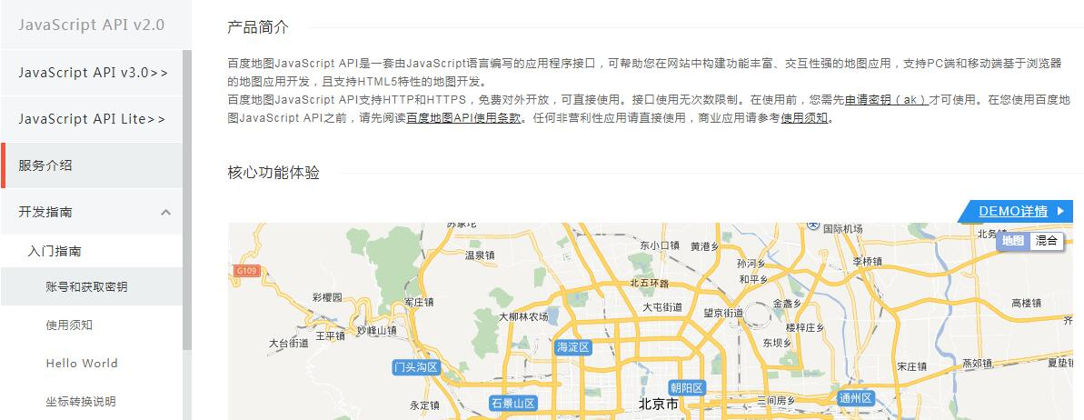 在使用百度地图服务前需要申请密钥(ak), 点击 开发文档 -> JavaScript API进入Javascript指南部分,按照指南注册好自己的密钥(ak)
