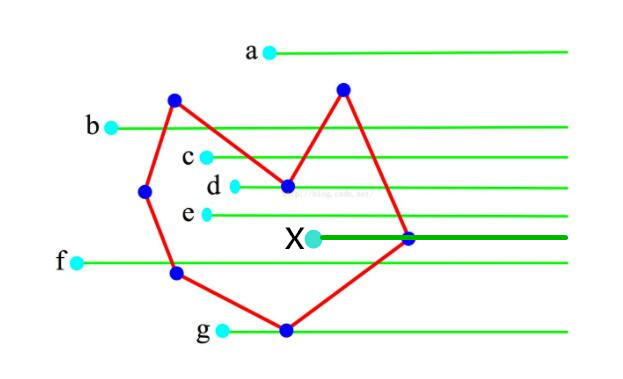 不过有一种特例,如果点在内部且与多边形的交点恰好在2个线段的交点上,比如X点,该点在多边形内部,但是该点与多边形2个边都有交点,只不过重合了,所以要特殊处理,对于这种特例,可采取如下办法解决