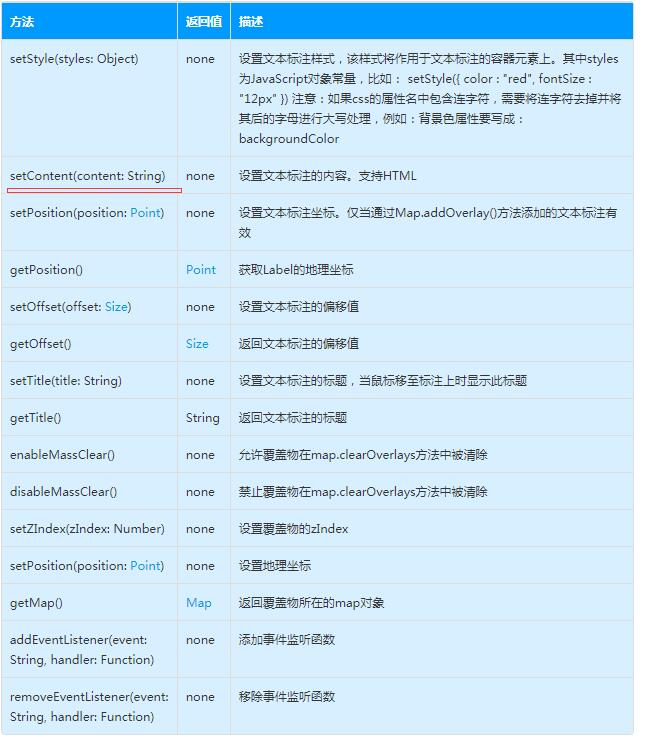 项目过程中遇到的一个坑:百度地图的api不是准确无误的,比如Label的api部分,当时我需要根据一个label实例得到label的文本内容,此文档只有setContent方法获取文档,没有getContent,当时我就震惊了,这怎么办?如果获取不到文本就没法做了,难道是百度地图漏写了?我在代码中尝试getContent()方法,果然!能够获取到文本且没报错,由此可见文档不是准确的,自己要多尝试才能得出准确结果