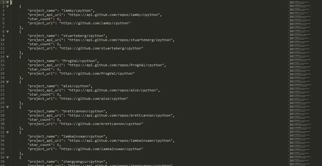 本文基于多线程(这里开启了10个线程),使用github的api,抓取fork cpython项目的所有5千多个项目信息,将数据存储到json文件中。