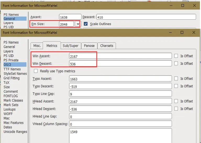 从上图中可以看到,使用(ascender+descender)/Em Size,即(2167+536)/2048≈1.32,也就是line-height为1.32.