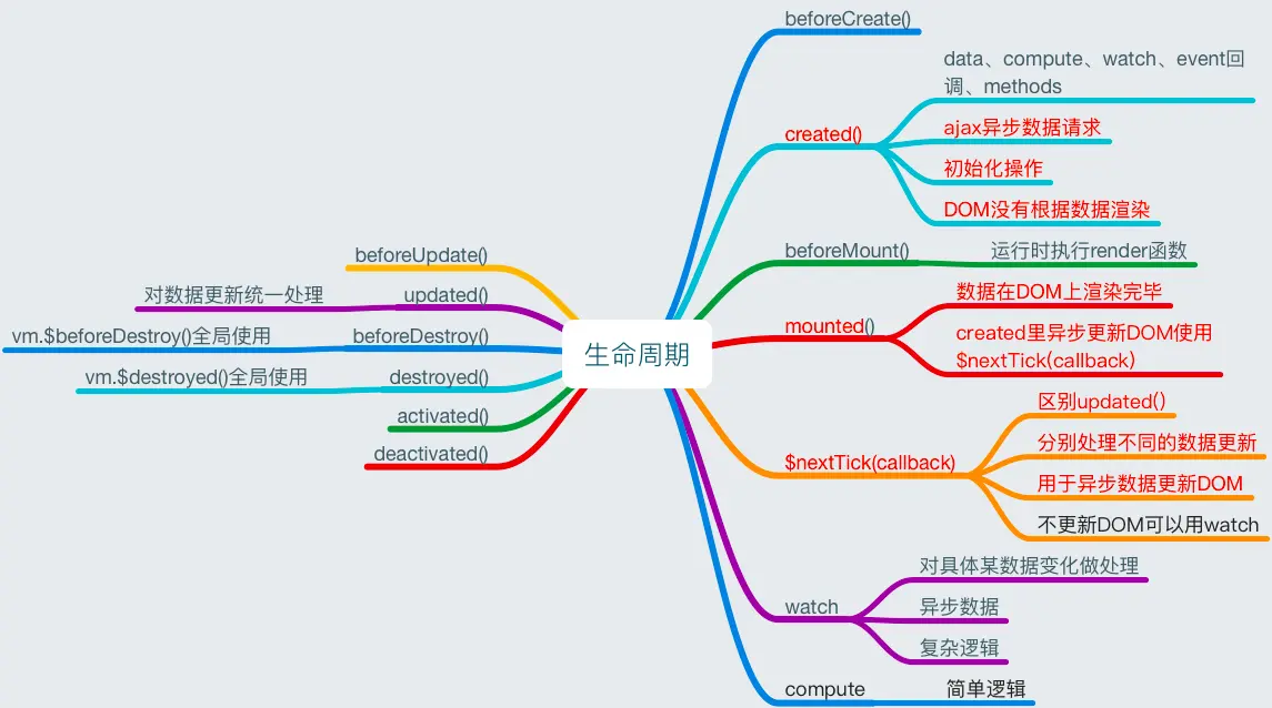vue的生命周期分为八个阶段:beforeCreate(创建前),created(创建后),beforeMount(载入前),mounted(载入后),beforeUpdate(更新前),updated(更新后),beforeDestroy(销毁前),destroyed(销毁后) 以及activated(活动中)和deactivated(不活动)