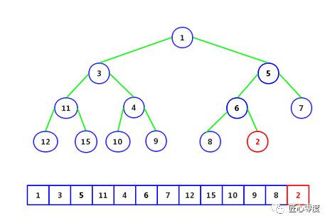 这是一个最小堆,其父节点总是小于等于任一一个子节点。现在我们添加一个元素2。