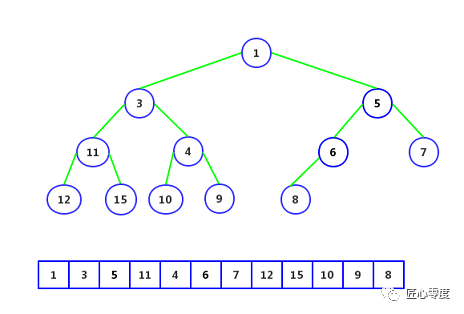 最小堆:父节点的键值总是小于或等于任何一个子节点的键值(下走图)