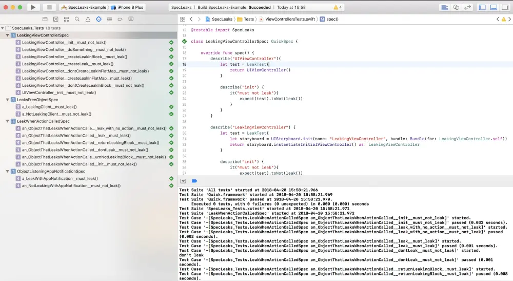 基于这些理论,我写出了 SpecLeacks,一个基于 Quick 和 Nimble、能够检测内存泄漏的拓展。核心就是编写单元测试来检测内存泄漏,不需要大量冗余的样板代码。