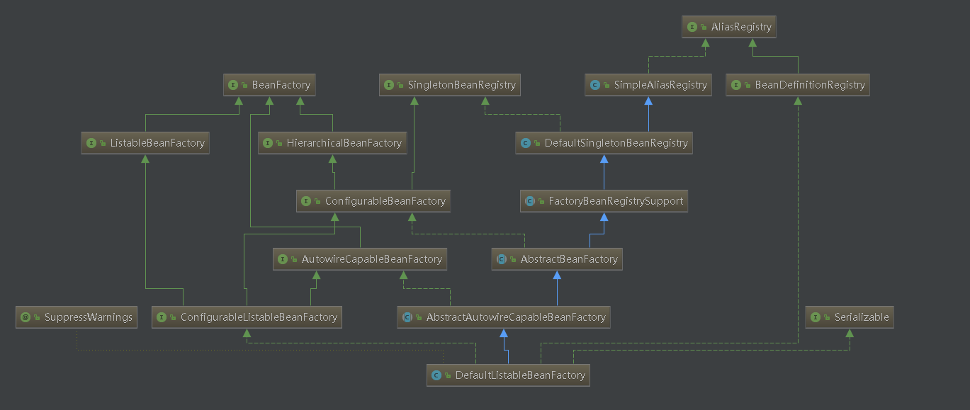 首先,看一下DefaultListableBeanFactory的类图,