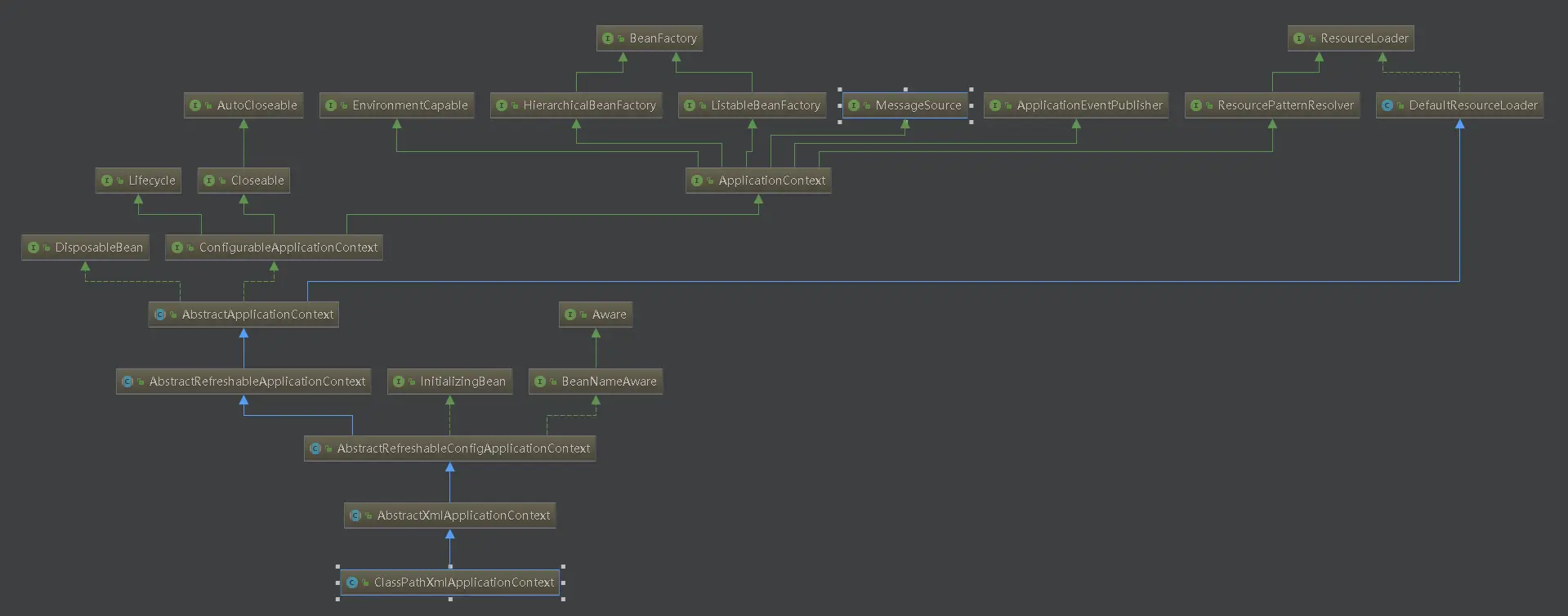 以《深入理解Spring系列之一:开篇》示例中的ApplicationContext applicationContext = new ClassPathXmlApplicationContext("applicationgContext.xml")为入口,进入源码内部,ClassPathXmlApplicationContext类图如下所示。