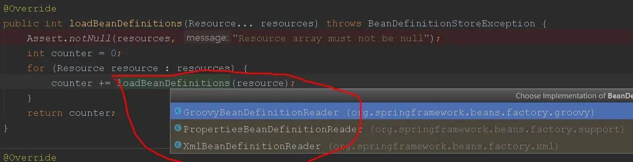 关注 counter += loadBeanDefinitions(resource) 这行代码,loadBeanDefinitions 方法是个接口。接口具体实现