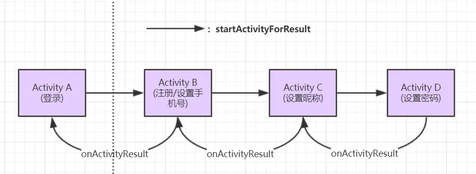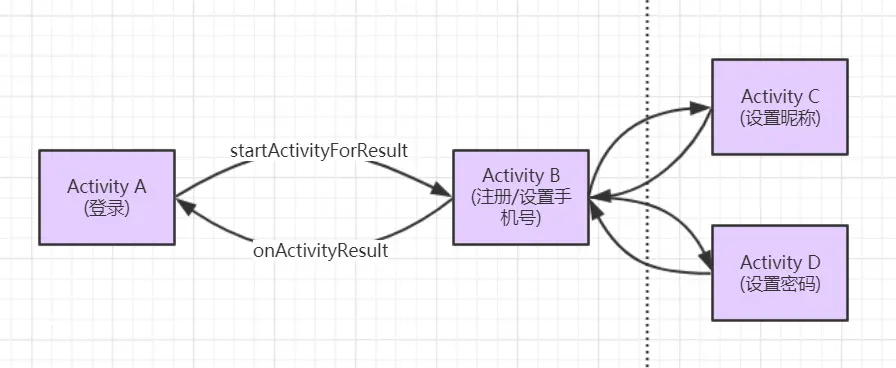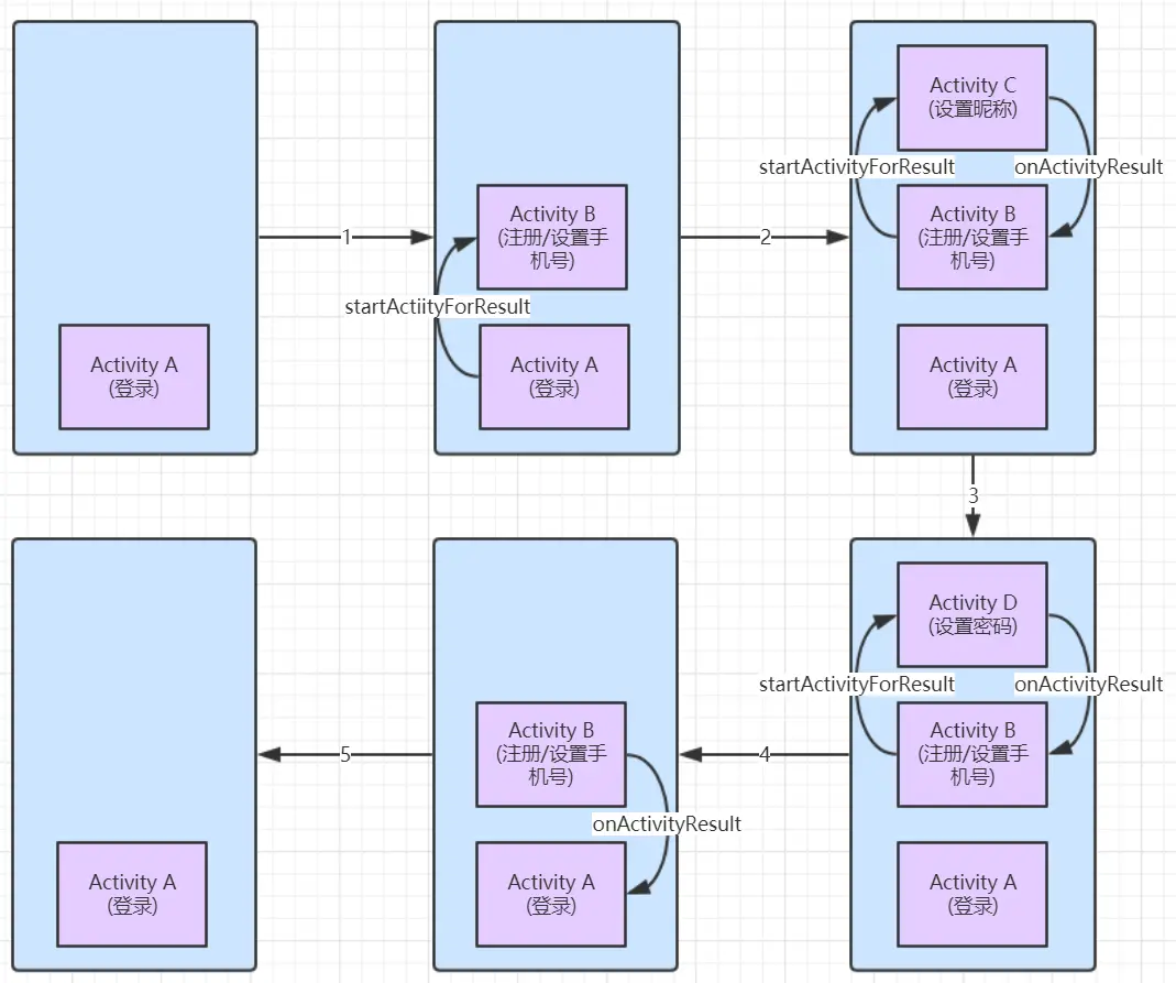 不过上面的流程是属于比较简单的情况,因为流程逻辑只有一个页面,而有时候一个复杂流程可能包含多个页面:例如注册,包含手机号验证界面(接收验证码验证),设置昵称页面,设置密码页面。假设注册流程是从登录界面启动的,那么使用 startActivityForResult 来实现注册流程的 Activity 任务栈的变化如下图所示: