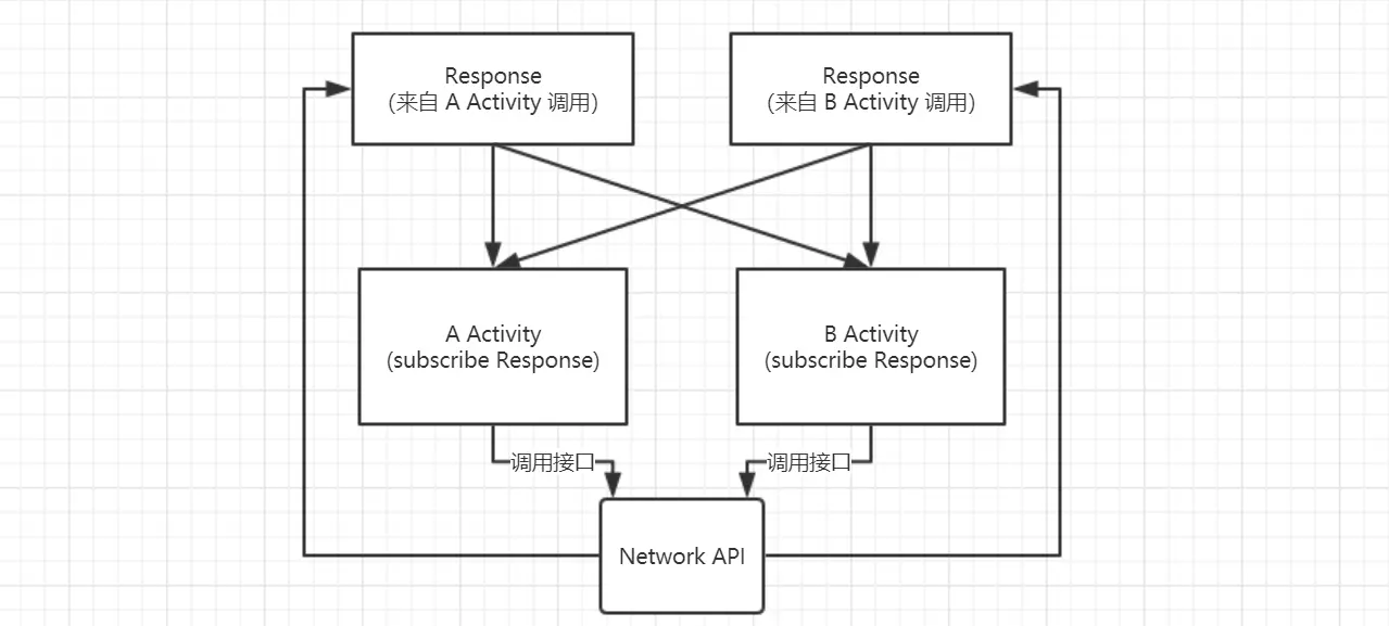 那它有什么不足之处呢?首先,发起一个一般的异步任务,开发者期望在回调中得到的是 这个任务 的结果,而在 EventBus 的概念中,回调中传递的是“事件”(例子中的 MessageEvent)。这里稍稍有点不同,理论上,异步任务的结果的数据类型可以就是事件的数据类型,这样两个概念就统一了,然而实际中还是有很多场合无法这样处理, 举个例子:A Activity 和 B Activity 都需要请求一个网络接口,如果把网络请求的响应的对象类型直接作为事件类型提供给它们的 Subscriber,就会产生混乱,如下图。