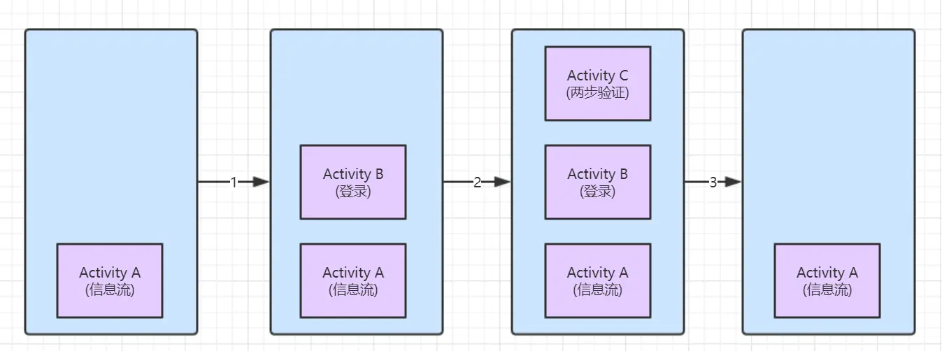 有一定实际 Android 项目开发经验的人,一定曾经在项目中处理过很多重复的业务流程。例如开发一个社交 App ,那么出于用户体验考虑,会需要允许匿名用户(不登录的用户)可以浏览信息流的内容(或者只能浏览受限的内容),当用户想要进一步操作(例如点赞)时,提示用户需要登录或者注册,用户完成这个流程才可以继续刚刚的操作。而如果用户需要进行更深入的互动(例如评论,发布状态),则需要实名认证或者补充手机号这样的流程完成才可以继续操作。