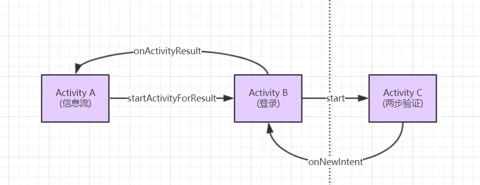 上面的例子中可能有一点令您疑惑:为什么每个步骤需要返回到验证手机号页面,然后由验证手机号页面负责启动下个步骤呢?一方面,由于验证手机号是流程的第一个页面,它承担了流程调度者的身份,所以由它来进行步骤的分发,这样的好处是每个步骤(除了第一步)之间是解耦和内聚的,每个步骤只需要做好自己的事情并且通过 onActivityResult 返回数据即可,假如后续流程的步骤发生增删,维护起来比较简单;另一方面,由于每个步骤做完都返回,当最后一个步骤做完以后,之前流程的中间页面都不存在了,不需要手动去销毁做完的流程页,这样编码起来也比较方便。