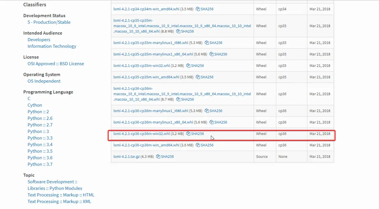 pip install lxml-4.2.1-cp36-cp36m-win32.whl
