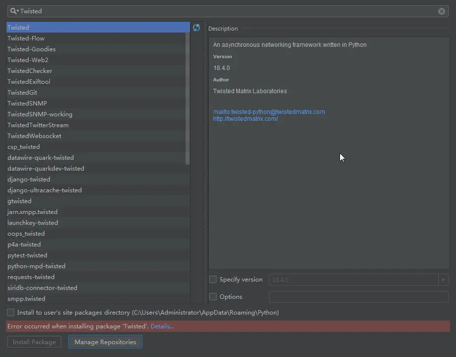 我这里用 Pycharm 安装不了,pip install Twisted 也不行,直接去下载 whl 文件回来安装