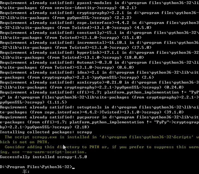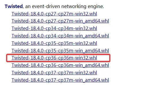 电脑是 python3.6 ,32 位的电脑,所以下载的是 Twisted-18.4.0-cp36-cp36m-win32.whl