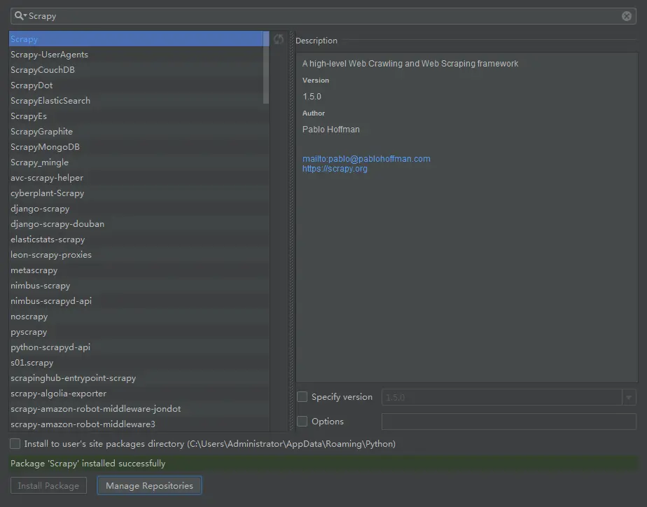 最后就是安装 Scrapy 了,在 pycharm 里面安装