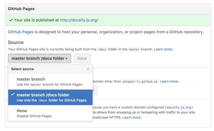 先在项目下创建 docs/ 目录,因为现在 GitHub 支持直接将仓库下的 docs/ 目录作为 GitHub Pages 的目录,当然你也可以放在 gh-pages 分支里。