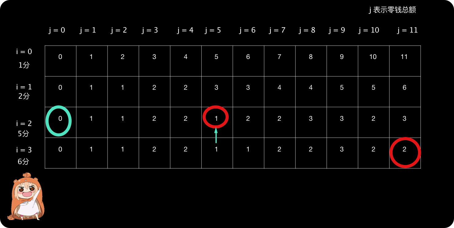 //锁定位置,确定i,j值,开始找构成结果的硬币组合。 其实根据这种计算方法,只需要考虑最右边那一列,从下往上推。