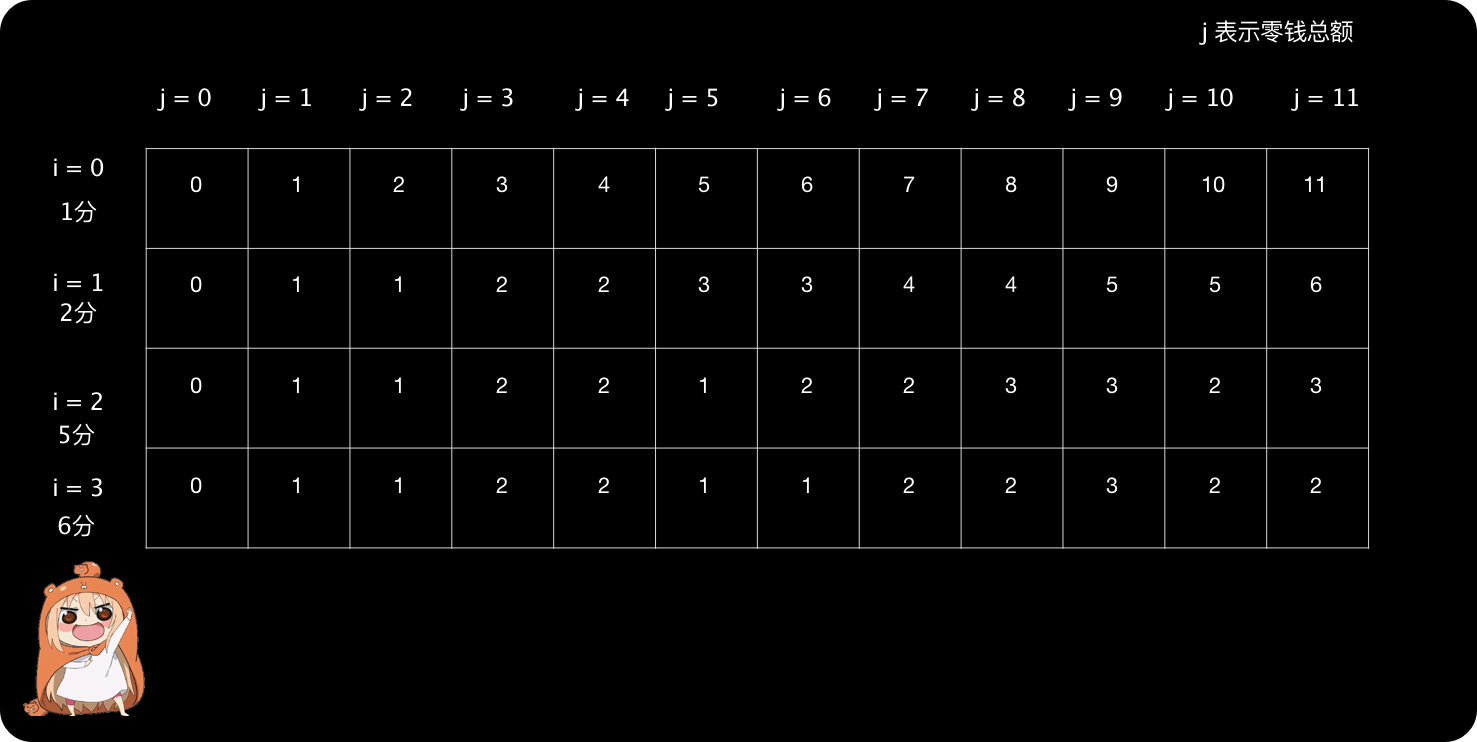 - 当填写第j列时,表示当前需要使用硬币凑出的总额。比如j=6,表示需要使用硬币组合出总额为6分的情况。