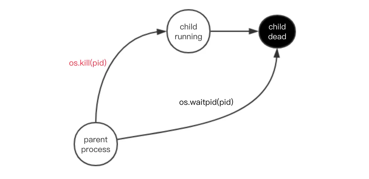 使用os.kill(pid, sig_num)可以向进程号为pid的子进程发送信号,sig_num常用的有SIGKILL(暴力杀死,相当于kill -9),SIGTERM(通知对方退出,相当于kill不带参数),SIGINT(相当于键盘的ctrl+c)。