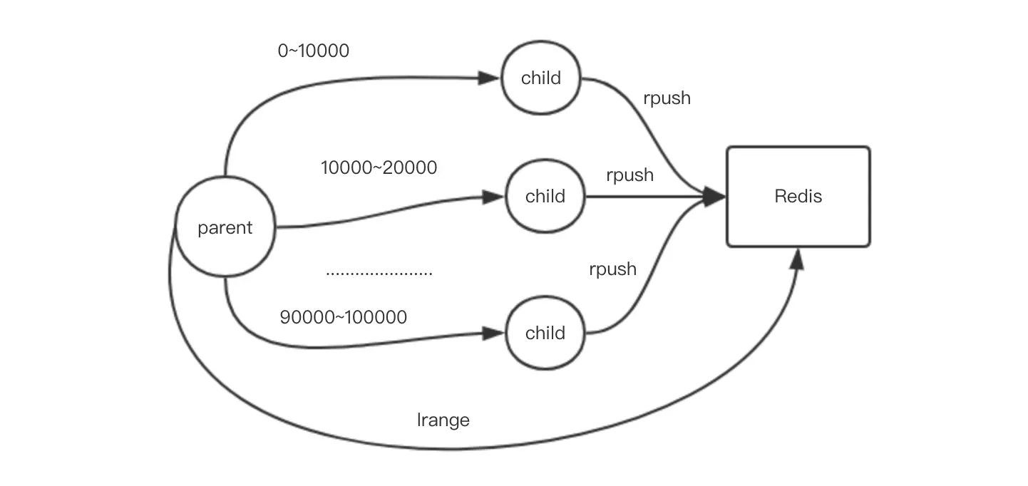 我们将级数之和的计算拆分成10个子进程计算,每个子进程负责1/10的计算量,并将计算的中间结果扔到redis的队列中,然后父进程等待所有子进程结束,再将队列中的数据全部汇总起来计算最终结果。
