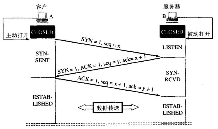 第一次握手:客户端发送连接请求,该TCP请求的首部,SYN标志位1,并且随机产生一个seq=x,并将该数据包发送给Server。