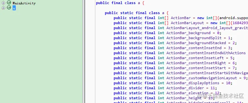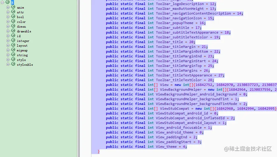 写插件前笔者谈及一点前提知识以及插件思路——为什么 R 文件中的字段可以删除?R 文件中的字段分为两种类型,一种是 static final int,另一种是 static final int[]。其中,static final int 作为常量在运行时是不会被改变的,那么将这些常量打进 apk 中很明显是多余的,所以实际上打包进 apk 的 R 文件有很大一部分是冗余的。