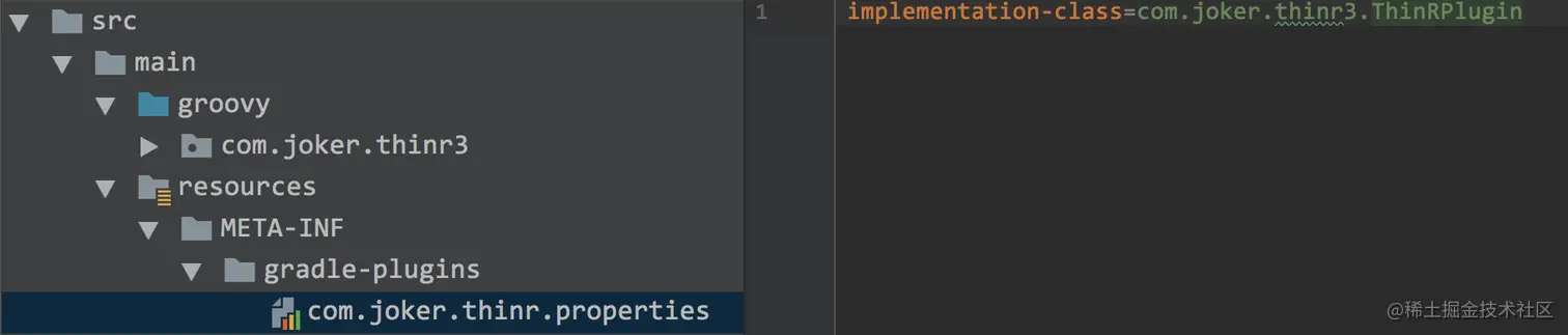 buildSrc,接着将 src/main/java 改成 src/main/groovy,并添加 src/main/resources/META-INF/gradle-plugins 文件夹,在该文件夹下创建 com.joker.thinr3.properties 文件并填写implementation-class指向 plugin,最终如下图: