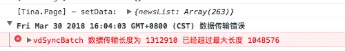 我们是一个新闻流的项目,用户可以无限下拉加载数据,内部会使用一个数组将列表的数据存储起来。当我美滋滋的使用 tinajs 重构完项目后准备试试的时候,我就发现,当我加载数据超过一定数量限制(大概200条数据)之后,控制台就会报“输出传输长度超过最大长度”的错误。