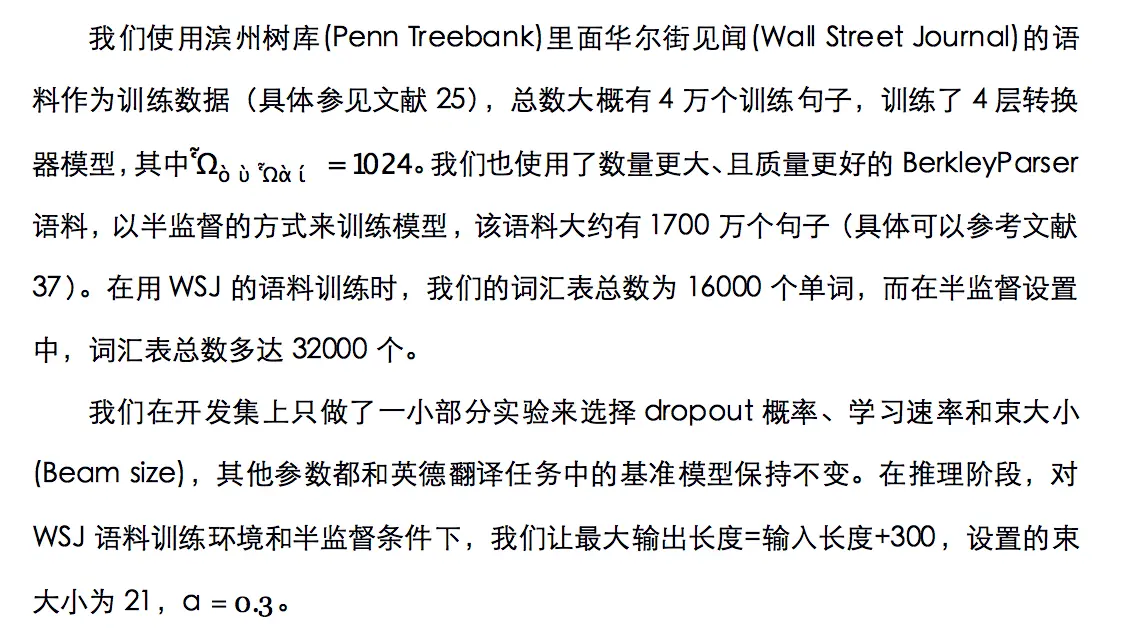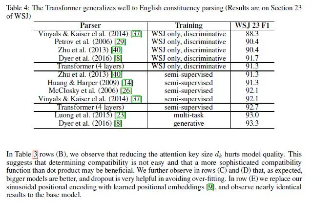 为了评价转换器模型能否泛化到其他的一些自然语言处理任务中,我们在英语语义解析任务上继续做试验。这项任务的挑战在于:输出序列有较强的语法结构约束,而且比输入的序列更长。即便是基于RNN的序列到序列的变换模型,在较小的数据输入条件,也不能超越当前最优结果(具体可以参见文献37)。