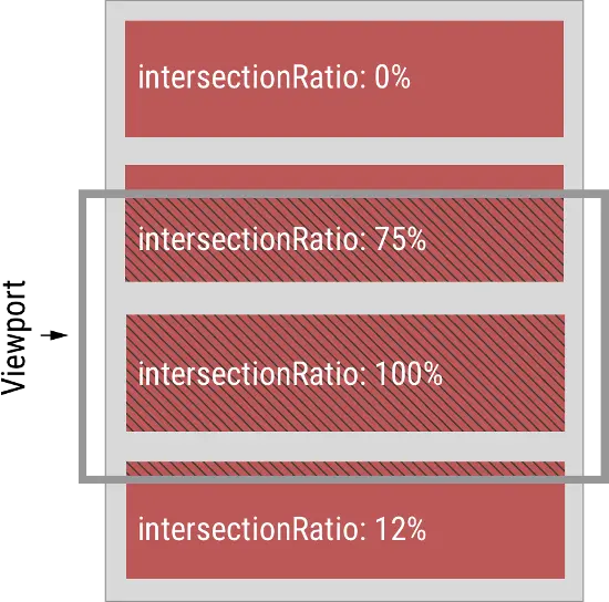上图中,灰色的水平方框代表视口,深红色的区域代表四个被观察的目标元素。它们各自的intersectionRatio图中都已经注明。