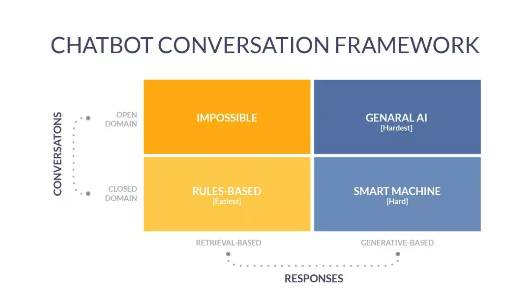 首先可以根据操作范围(是否严格限定于某一闭合域,如天气机器人或披萨机器人,或进行各种类型的通用对话),以及为了响应用户输入所要进行的计算方式(是否会直接检索预定义的响应内容,还是根据输入的信息生成对应的响应结果),将对话式 AI 划分为不同类型。