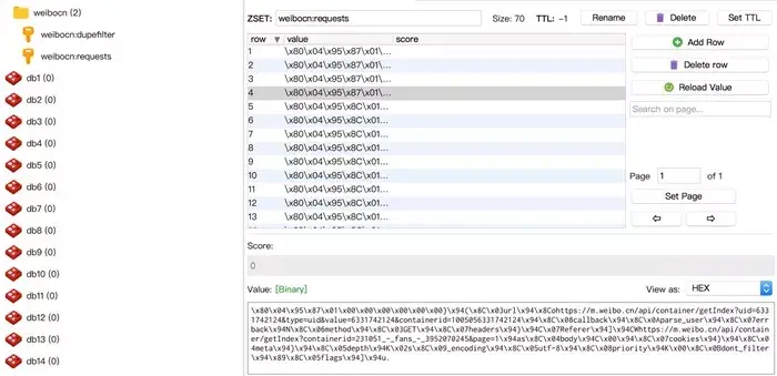 scrapy crawl weibocn每台主机启动了此命令之后,就会从配置的Redis数据库中调度Request,做到爬取队列共享和指纹集合共享。同时每台主机占用各自的带宽和处理器,不会互相影响,爬取效率成倍提高。