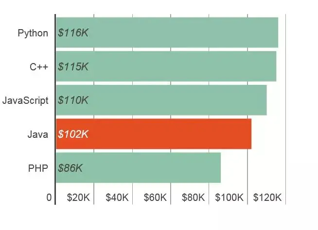 Java 作为普及率最高的开发语言,可以提供的职位涉及广泛,这也使得 Java 在薪资榜上名列前茅,从整体上来看,Java 的工资水平是中等偏上的。