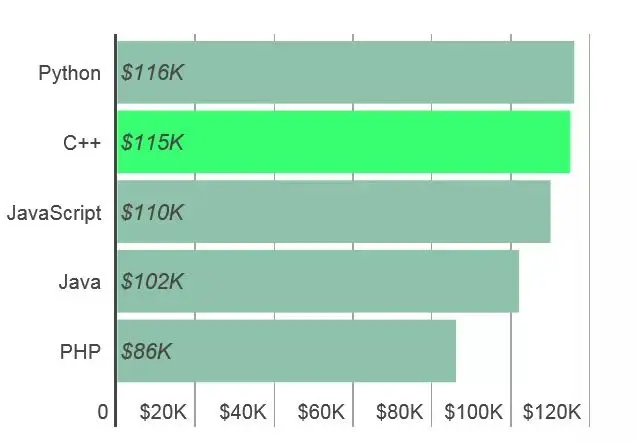 C++同样一种十分受欢迎的编程语言。如果你愿意花时间去掌握她,大量工作机会将向你敞开大门,而且C++的薪资也相对偏高。